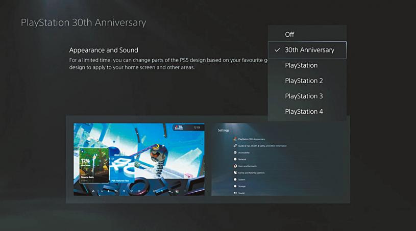 安裝了這項更新後,軟體會在首次啟動時提示你選擇一個主題。正如眾所期待的,這些主題會改變PS5主畫面選單的配色與音效,以匹配各代主機的使用者介面。你也可以在主機設定選單頂端新增的「PlayStation 30周年」選項中,試用其他主題。