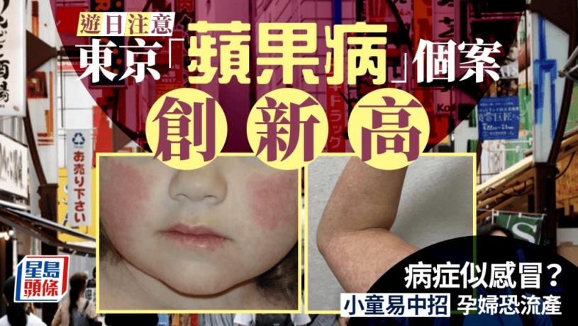 紅斑症是出疹性疾病,其中一個特徵是患者的兩頰會出紅疹,彷如蘋果,故被稱為「蘋果病」。綜合《TBS》等報導,進入11月後感染蘋果病的患者急遽增加,截至12月1日的一週內,東京都264間醫療機構通報的「傳染性紅斑」個案達796人,刷新自1999年開始統計以來的最高紀錄,而且已連續三星期超過警戒級別。這是2018年以來,患者人數首度超過警戒級別。