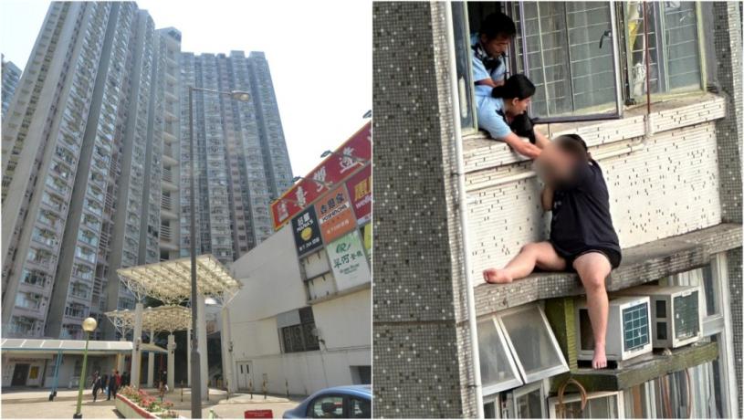 警方在「大埔警區」的Facebook專頁發帖並上載相片,相中見到一名女子坐在窗外石壆位置,狀甚危險,幸有一男一女警員合力拉住女子的手,協助她返回屋內。