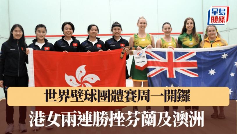 香港女子隊於周一在香港足球會展開的世界壁球團體錦標賽分組賽出擊,連挫芬蘭及澳洲,暫於F組列首位,周二下午3時將鬥南非,爭首名出線16強。
