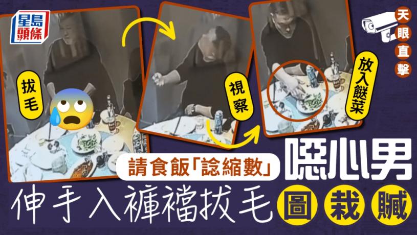 內地又傳出噁心栽贓圖食霸王餐事件。湖北有男子在請朋友吃飯後「諗縮數」,在飯桌前伸手入下體拔出陰毛,放入吃完的餸菜內,圖逼店家免單。不過,即使賤男拔毛前後曾刻意檢查房內是否有監控,但仍天網恢恢「睇漏眼」,醜態全程遭CCTV拍下,被店家揭發。