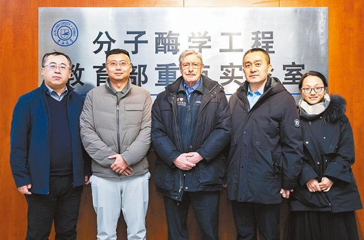 羅伯茲教授(中)參觀分子酶學工程實驗室。