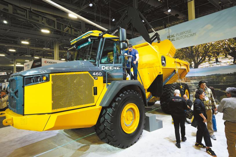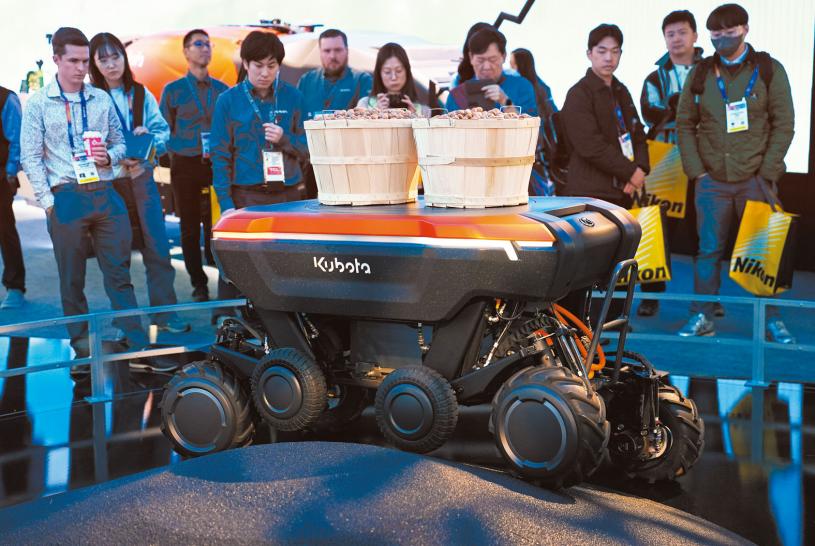 農業機械製造商「強鹿」(John Deere)的攤位擺滿了拖拉機和垃圾車等全自動重型車輛,不遠處的拖拉機商Kubota則示範其研發的AI技術,能夠偵測農作物感染的疾病,並向害蟲所在位置施放殺蟲劑。
