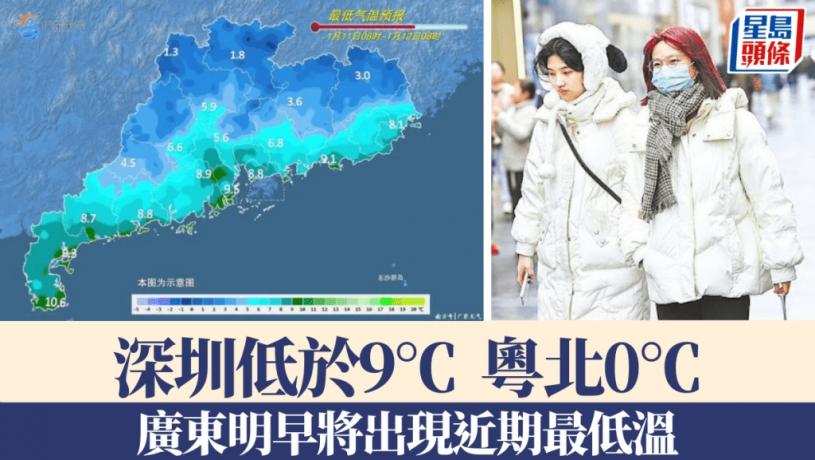 寒潮襲廣東,深圳周日(12日)跌穿10℃!「南方網」消息,預計11-14日廣東大部市縣晴冷乾燥,森林火險風險等級高,晝夜溫差大;周日早晨將出現近期最低氣溫,廣東全境絕大部分地方都會低於10℃,深圳最低氣溫更跌至8.8℃,粵北偏北市縣0-3℃,高海拔山區零下3-零下1℃,粵北偏南市縣和珠江三角洲北部市縣4-6℃,有冰凍和霜凍。至於下周一至二(13-14日),南部和西部市縣雲量增多,漸轉有分散小雨,氣溫逐日回升。