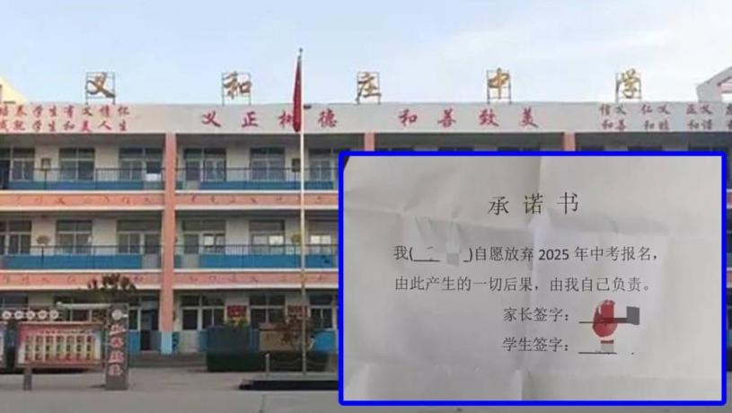 據極目新聞報道,有自稱學生家長的網民近日爆料,指河北保定涿州市義和莊中學,要求自己尚未考中考的孩子,簽署承諾書表示「自願放棄中考,一切後果自行承擔」,並建議孩子們走單招,又指「校長躲著也不出來(見面)。」,家長質疑校方「一天天的就為了學校的一點升學率,想要升學率好平時怎麼不注重教育呢」。