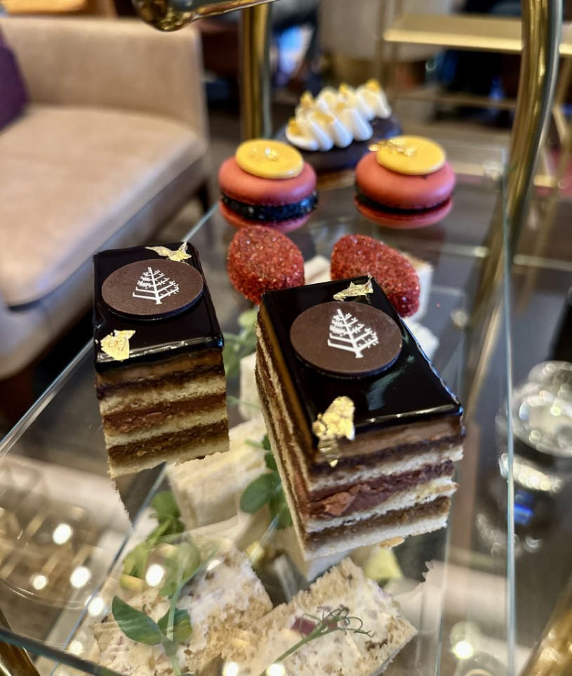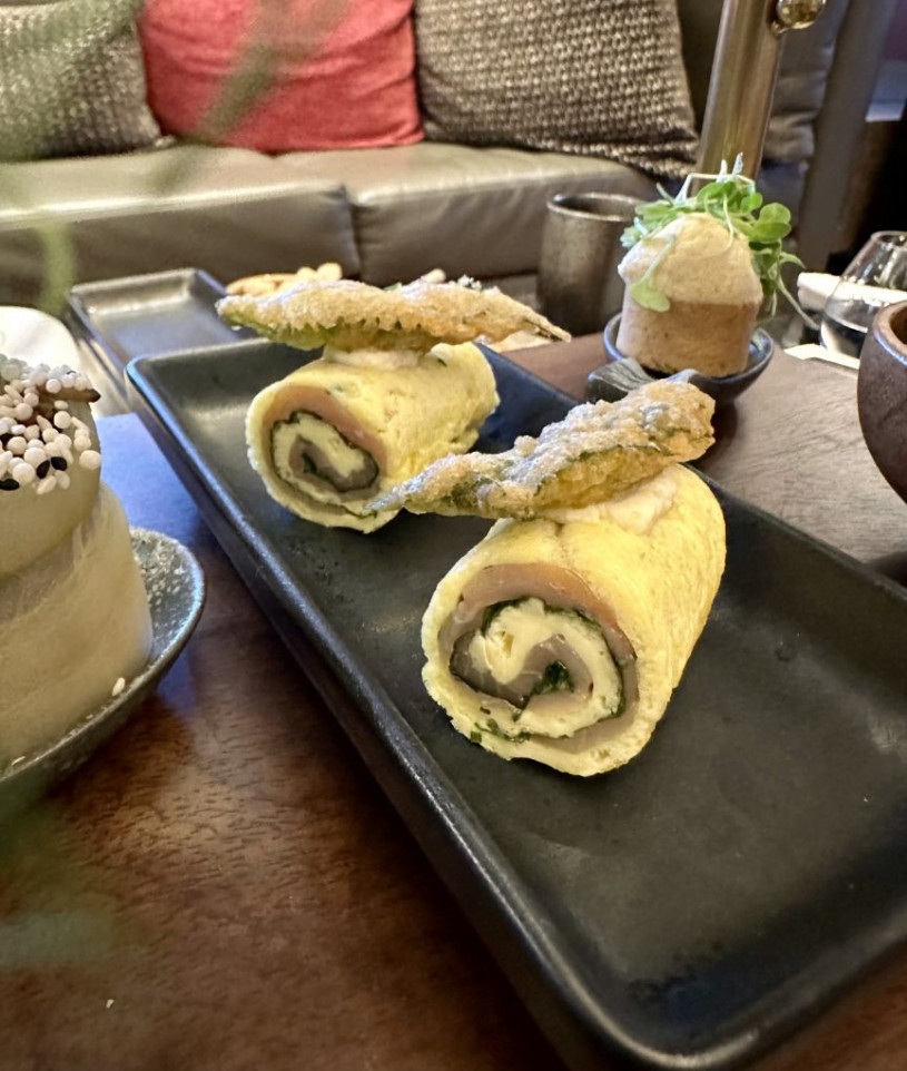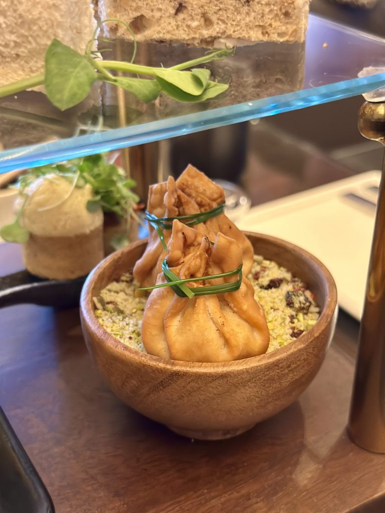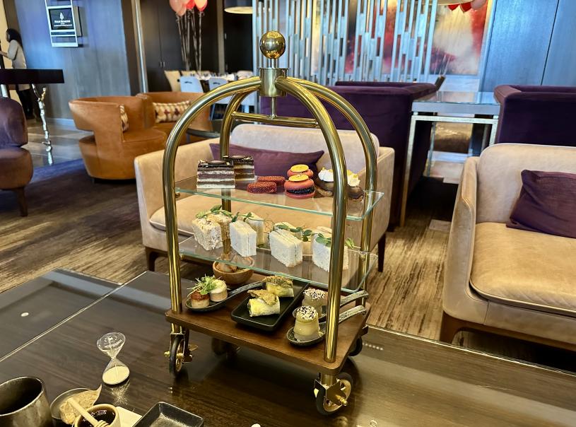 跟著出場的是一架子的茶點和甜品。看真一點,這個架子是迷你版的酒店行李推車,實在可愛。不過,我們對擺放在上面的茶點更感興趣。雖然桌上有刀有叉,我們選擇用手拿著茶點三文治和甜品直接送進嘴巴更自在!三文魚卷和菇菌卷特別可口。伴侶品嚐牛肉茶點時,我就品嚐廚師精心為我準備的鷹嘴豆泥撻。