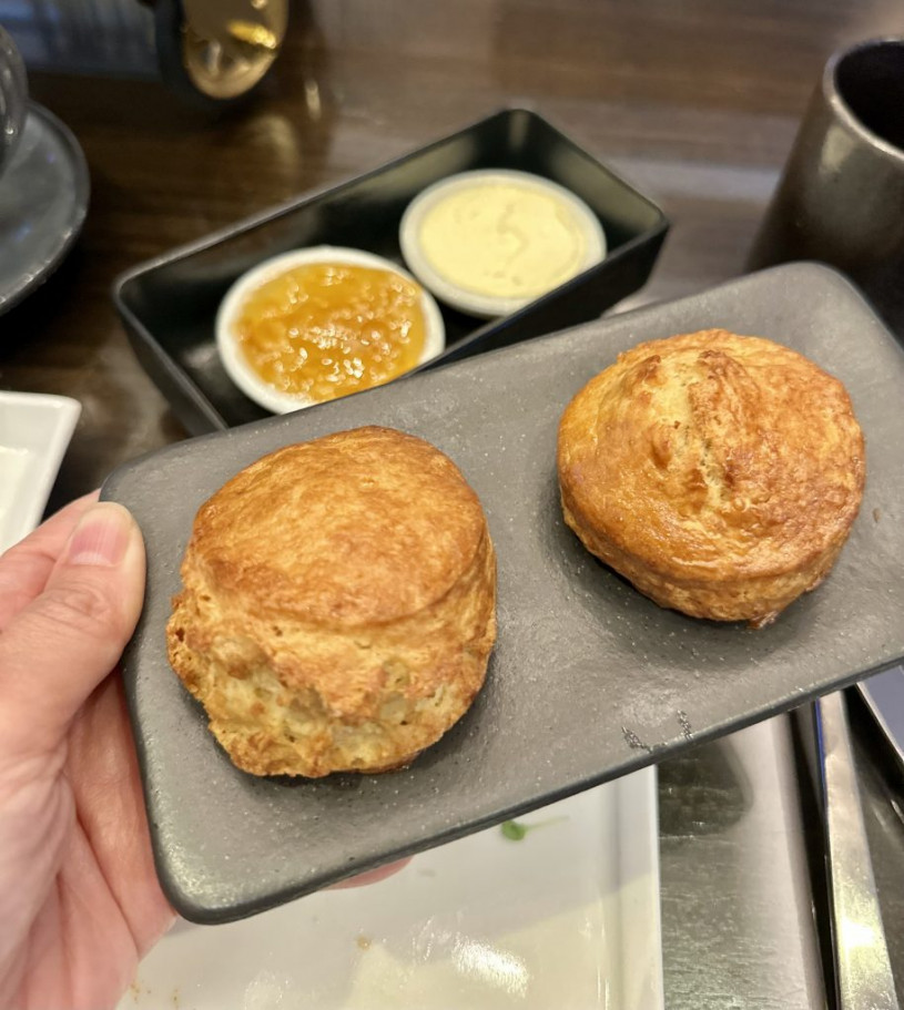 當服務員送上茶點而沒有司康時,我心很安樂,這證明酒店高度重視司康送出來的時間,需要稍後保持新鮮出爐的效果。事實上,司康送出來時暖呼呼口感鬆脆,單吃或塗上奶油果醬都好吃。把整個司康吞了之後才發現忘記塗蜜糖,下次吧!