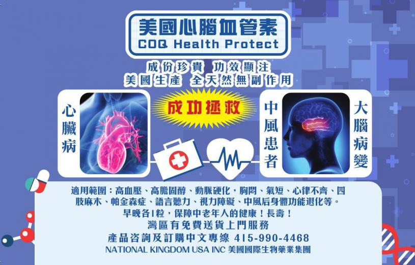 基於心腦血管疾病的複雜性和危害性,如何找到既能治標又能治本的方案,避免心肌梗塞和中風的發生?美國國際生物藥業集團經過長期研究,研製出了CoQ10 Health Protect美國心腦血管素。該產品含有輔 Q10、西洋參、田七等核心成分,並輔以鎂、硅等微量元素,來自全天然名貴草藥,由美國CGMP藥廠生產,安全無副作用。它能有效保護脫氧核糖酸(DNA),抑制自由基對細胞的破壞,並強化抗氧化能力,維持血液正常循環代謝。對於防治心肌梗塞、中風及中風後康復表現突出,因而被譽為中老年人健康長壽的“保護神”本品適用人群:高血壓、高血脂、高膽固醇、動脈硬化、心律不齊等心腦血管疾病患者,或患有語言、聽力、視覺障礙,吞嚥困難,帕金森症,偏癱,中風後遺症及肝腎功能衰退等病症的人群。
