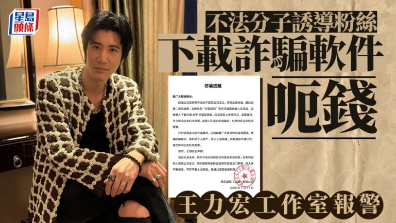 歌手王力宏的工作室於1月17日發布防騙提醒,稱近期有不法分子冒充公司名義,採取發送快遞、通過掃二維碼進群、安排任務「聽歌返現」等形式,騙取被害人信任,誘導被害人下載詐騙App並騙取金錢,公司已向公安機關報警。