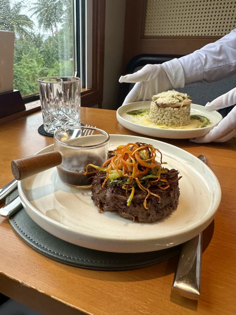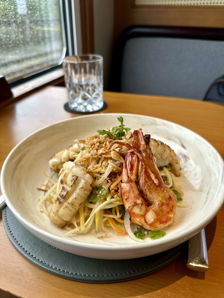 午餐時間到了,我們一早選擇好的菜式一道一道端上來。無論擺盤,口感和味道都是一流。我的前菜是一份海鮮沙拉,食材新鮮豐富,混入當地的口味帶酸帶辣,無比開胃。