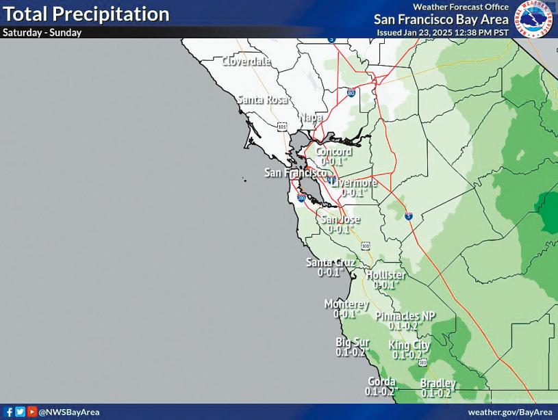 全州24日仍會持續乾燥與和暖,25日出現大逆轉,一股將帶來降雪的低氣壓系統從加拿大直接南下加州,並帶來更寒冷的空氣。由於這股系統在陸地上盤旋,而非越過太平洋上空,因此缺乏水分。它的濕氣僅足夠為中、南加州帶來陣雨和陣雪,但情況不穩定。國家氣象服務局氣象學家基特爾(Ryan Kittell)向《三藩市紀事報》指出,天氣變化依賴於風暴的確切路徑,「如果它進一步西移50或100英里,每處地方就會看到較多的雨量。如果往東移,那麼雨量就不多,有些地方甚至可能無雨。」太浩湖地區預計出現多周以來首場降雪,但整體降雪量的預報差異甚大,從薄薄一層到半呎不等,取決於風暴的路徑,到24日預報將會更為明確。