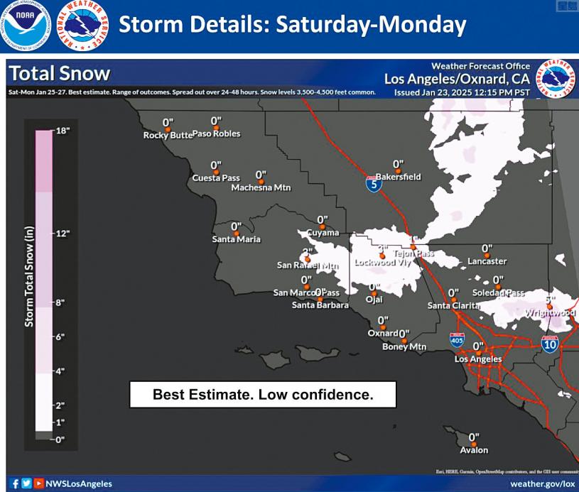 這股風暴更異常的部份在於科恩縣(Kern County)的雨雪線非常低。卡爾布說︰「這股周末風暴的一大隱憂是特洪隘口(Tejon Pass)和特哈查比隘口(Tehachapi Pass)會否降雪。」受到山火蹂躪的洛杉磯縣北部「休斯山火」(Hughes Fire)所在較高海拔地區也可能降雪。