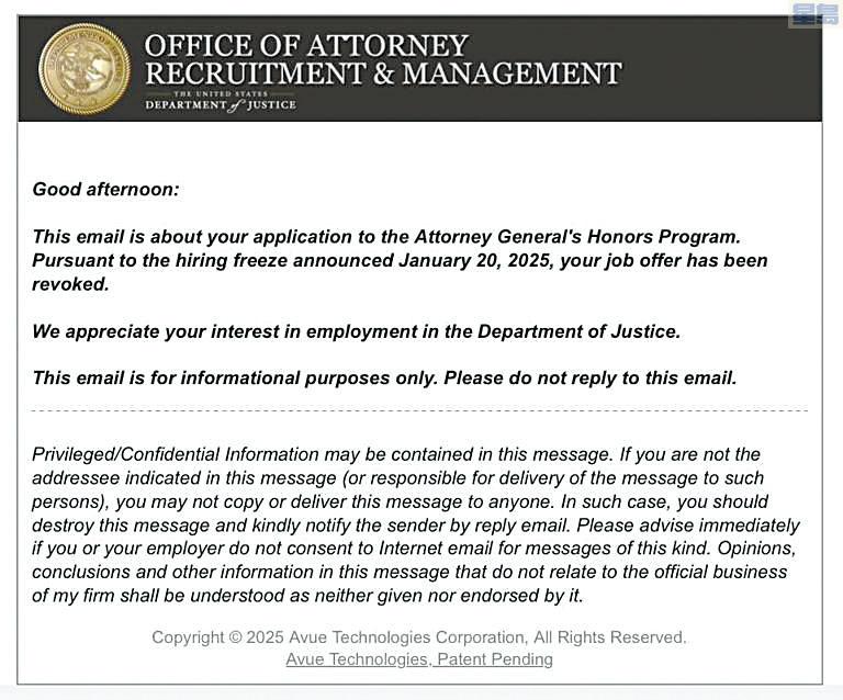 此項決定是22日下午經由司法部電郵被宣布的,電郵援引了特朗普宣誓就職後不久所宣布的凍結政府招聘政策,電郵寫道:「根據2025年1月20日宣布的凍結招聘政策,你的錄用通知已被撤銷。」