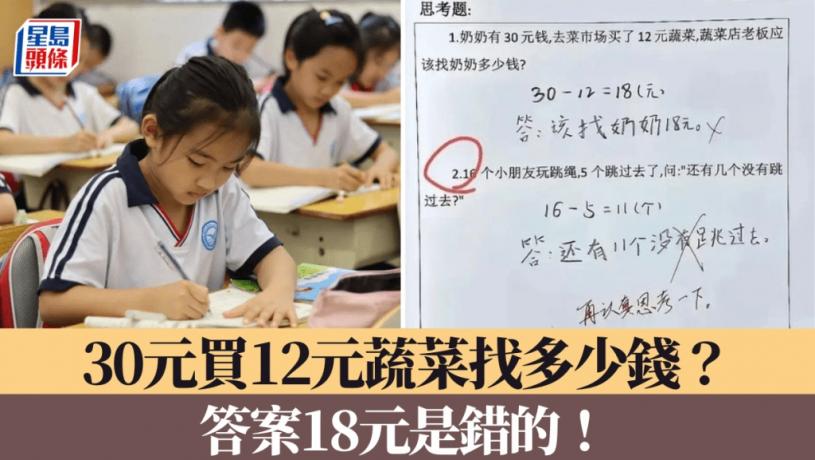 數學題考的不是數學?近日內地互聯網流傳一張小學數學考卷,有兩道題目顛覆大家的想像,更像是腦筋急轉彎。其中一題是,用30元(人民幣,下同)買12元蔬菜,老闆應該找多少錢?小學生回答18元,老師卻指答錯,引發網友熱議。