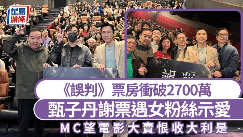電影《誤判》自12月21日在本港開畫至今,累積票房已超過2700萬!為答謝觀眾對電影的支持,身兼監製、導演及領銜主演的甄子丹,聯同MC張天賦及鄭則士(Kent)現身戲院謝票!當三位主演現身時,現場觀眾即以尖叫歡呼拍手歡迎,見到一班熱情影迷的支持,甄子丹表示:「之前一直在忙,終於可以加入團隊一齊同大家謝票,衷心感謝每一位入場支持嘅觀眾朋友!新一年祝大家金蛇添福!」而早前一直忙於工作的甄子丹,今日現身更遇上女粉絲公開示愛:「真係好喜歡你呀甄生!本身今日搭飛機走,但知道可以見到你,我即刻改機票啊!希望你拍多啲動作電影俾我地睇!」面對女粉絲示愛,甄子丹回應:「多謝你,雖然我年紀唔細,但能夠拍到嘅時候都會繼續拍!」
