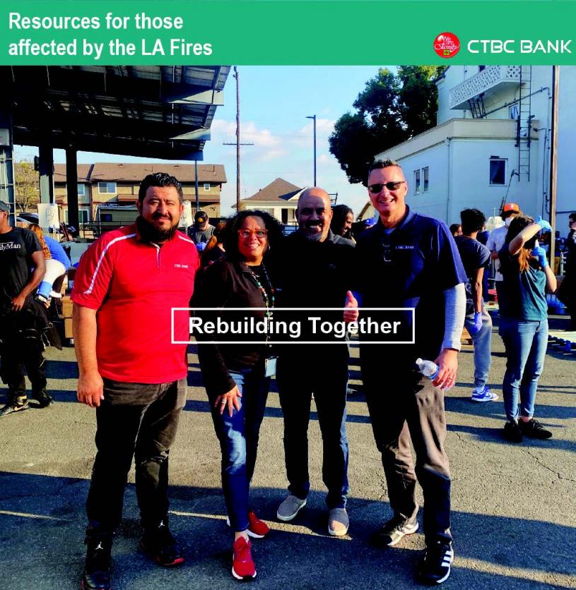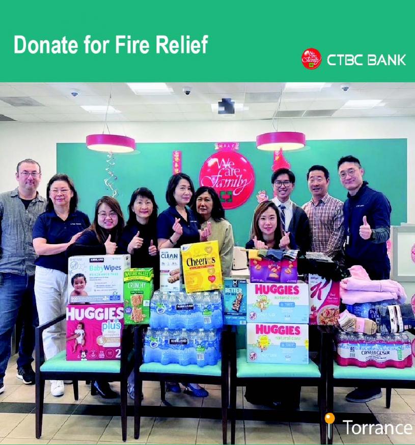 南加州大火災情發生後, 美國中國信託銀行立即與當地非營利組織 [Shelter Partnership]合作,與中國信託銀行位於南加州洛杉磯地區的14家分行人員及客戶齊心協力,收集並捐贈總價值超過$15,000美元的救援物資,贈予給需要幫助的災情受災戶。救援物資包括嬰兒尿布,濕紙巾,瓶裝水,蛋白質能量食品、保暖衣物等,整合後一併運送至洛杉磯市中心的Dream Center,以便為受災戶提供第一線及必要的資源協助。