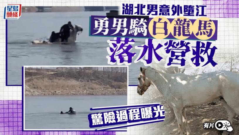 在湖北,2月4日下午一名男子在漢江仙桃段意外墮江,在離岸邊約50米掙扎,他的親屬在岸邊撕心裂肺地哭喊著「救人」。危急時刻,見義勇為男子騎著一匹白馬躍入江中協助救人。最終,男子被成功救上岸。