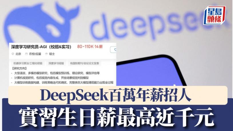 最近,在全球AI界引爆熱議的內地新創企業深度求索(DeepSeek)正為其炙手可熱的業務擴大招兵買馬。據內媒報道,DeepSeek正招聘52個職位,多個職位年薪可達百萬元人民幣,實習生日薪最高近千元。