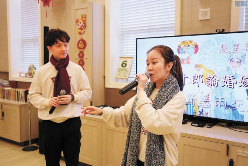來自香港的粵劇名伶梁振文、梁芷萁,昨天把粵劇戲寶《帝女花之香夭》、《拾釵》、《牡丹亭驚夢之幽媾》的精彩唱腔,帶進安樂居,並向長者們送賀年揮春。