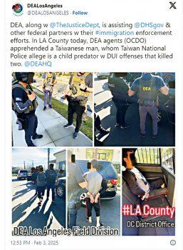 據FOX報道,美國移民及海關執法局(ICE)聯合聯邦緝毒署(DEA)及其他聯邦執法部門,近日在洛杉磯展開大規模執法行動,鎖定非法移民及涉及重大犯罪的外籍人士。根據緝毒署洛杉磯分局2月3日發布消息,當局當日在洛杉磯縣逮捕一名來自台灣的華裔男子,該男子遭台灣警方指控為兒童性侵犯,並涉及一起因酒後駕駛導致兩人死亡的案件。