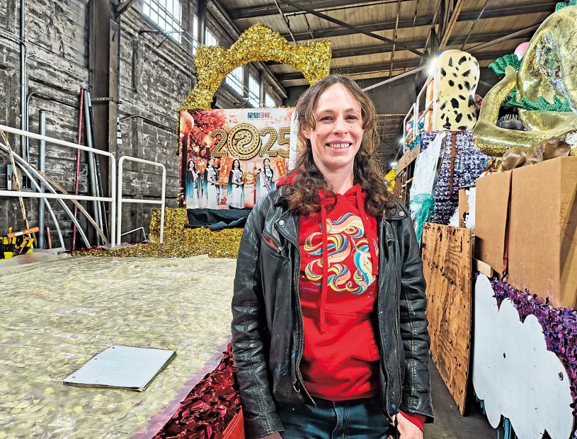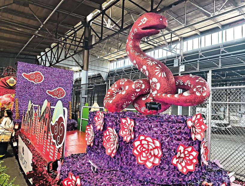 19號碼頭內,21輛巡遊花車已進入最後的裝飾及調試階段。花車製作公司老闆及藝術指導穆夫森(Stephanie Mufson)站在《星島日報》的花車前激動地說:「能與蛇年的花車一起,每天感受到花車上不斷豐富的內容,是一件多麼令人興奮的工作!」