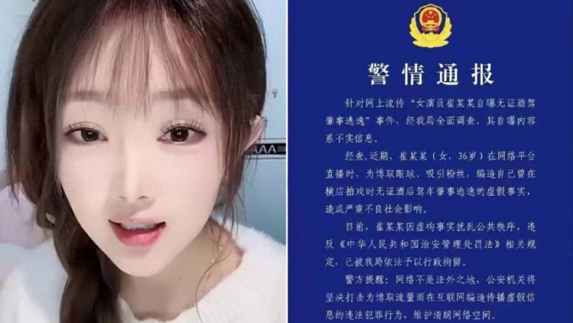 東陽警方通報,經查,近期,崔某某(女,36歲)在網路平台直播時,為博取眼球、吸引粉絲,編造自己曾在橫店拍戲時無證酒後駕車肇事逃逸的虛假事實,造成嚴重不良社會影響。目前,崔某某因虛構事實擾亂公共秩序,違反《治安管理處罰法》相關規定,已被依法予以行政拘留。