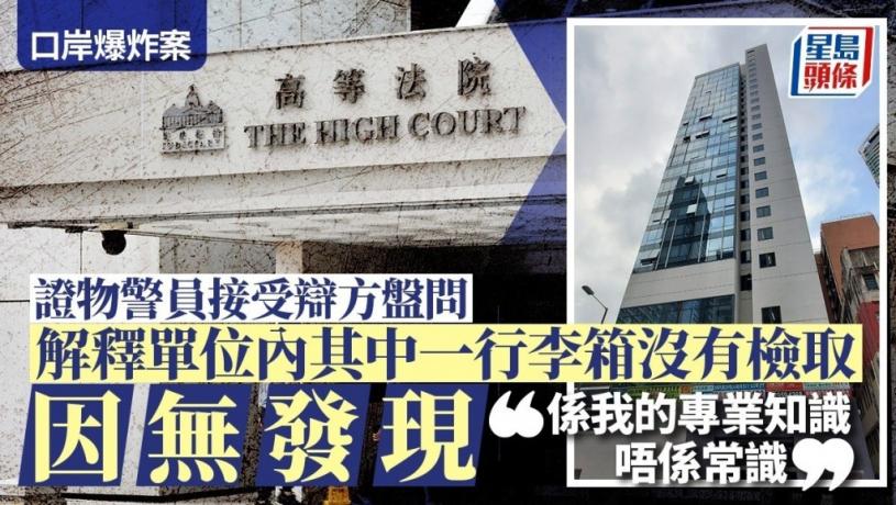 8男女涉2020年初口岸爆炸案,今於高等法院踏入第53天審訊。辯方盤問證物警員時,指涉案單位內除了一個裝有懷疑爆炸品的行李箱以外,另有一個行李箱,為何沒有檢取;另提到警員當時應想到疑人用行李箱運送爆炸品,而他可透過常識或調查經驗決定檢取甚麼物品。警員供稱因為另一行李箱「無發現任何與案有關嘅證物」,又稱「呢個係我嘅專業知識,唔係common sense(常識)」。