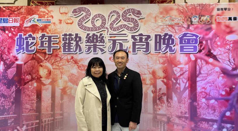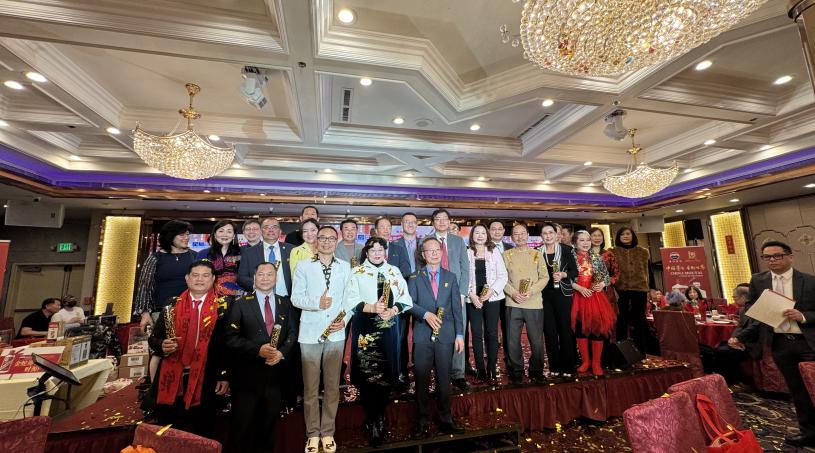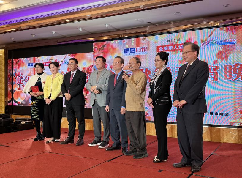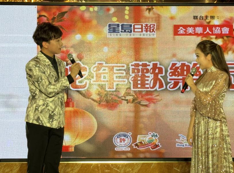 星島日報蛇年歡樂元宵晚會,美西版社長兼總編輯梁建鋒(左)與全美華人協會南加州分會主席關鍵榮(右)合影。 記者陸新攝
