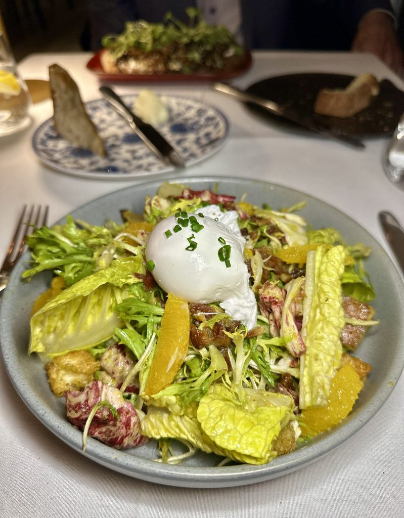另一份前菜是一份沙拉。我和伴侶那天早上剛剛逛完農夫市集。在市集上見到的合時令蔬菜就在眼前的沙拉裡,加上一顆半生熟的雞蛋,蛋汁混在沙拉中成為醬料之一,再撒上培根顆粒,醋汁偏酸,成為一道很開胃的前菜。