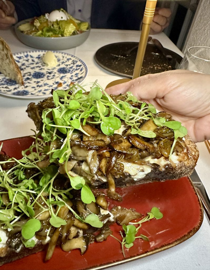 前菜的布拉塔菇菌烤吐司份量很大。一塊麵包切開兩份,剛好讓我們分享。麵包上面鋪上炒好的菇菌混入葡萄乾,布拉塔芝士軟軟的成為塗在麵包上的醬料。葡萄乾的甜味帶動著其他食材的味道,製作出人以外的美味。