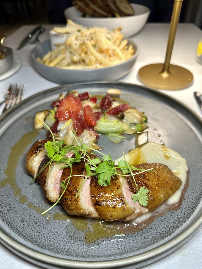 伴侶點的主菜是鴨胸肉。他吃了一口說從來沒有吃過這般美味的鴨肉,皮脆,夾一點肥肉,然後胸肉部分燒得火候到家,肉嫩滑。他吃得津津有味,就算是伴碟的炒蔬菜他也非常喜歡。