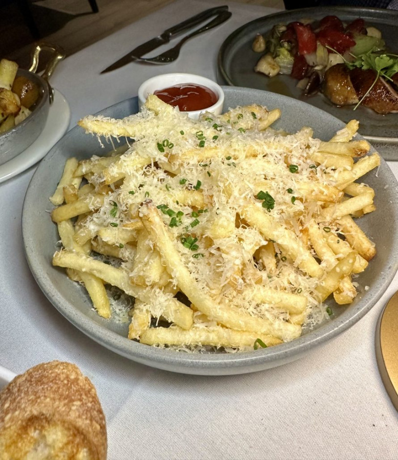 我們還點了兩道伴菜,一份是服務員介紹說吃得開懷的松露油炸薯條,撒上芝士後更加可口。另一份是燒烤根莖蔬菜,同樣可口。