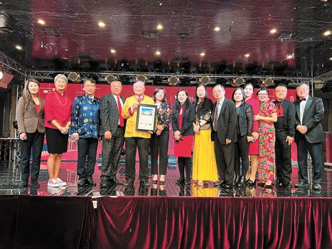 國會議員孟昭文頒表揚狀給亞美醫師協會,並與市議員黃敏儀及協會高層合照。