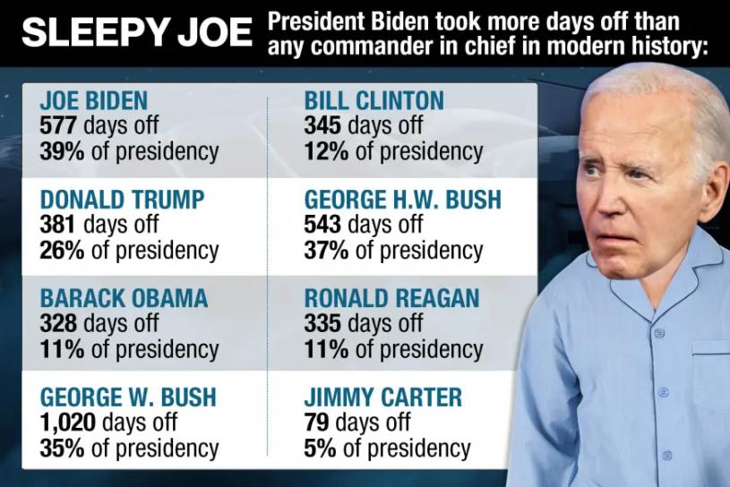 共和黨全國委員會(RNC)表示,前總統拜登在位4年期間,在總共1463天內,577天處於休假狀態,佔比達到39%,成為現代歷史上休假時間最長的總統。