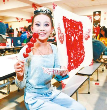 一位女孩在活動中吃到糖葫蘆非常開心。
