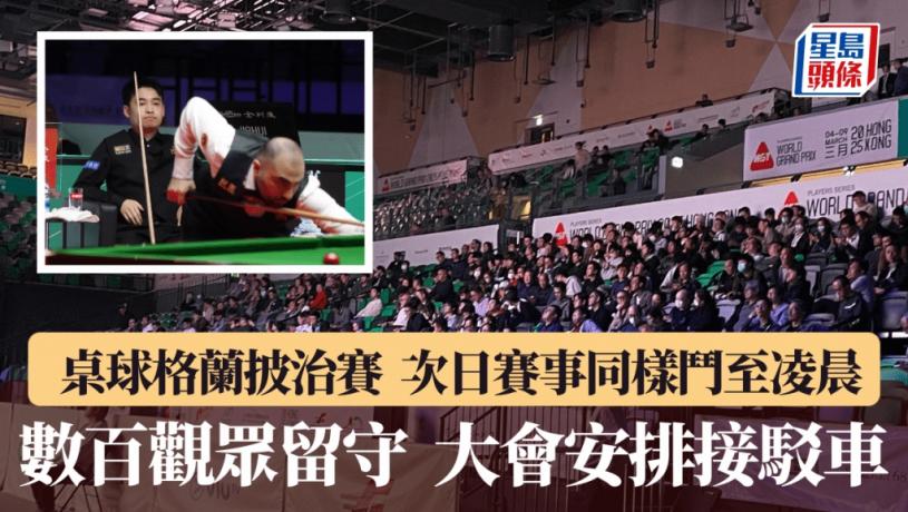 周三上演的第二天世界格蘭披治桌球大獎賽香港站比賽,跟首天一樣,最後一場賽事打至凌晨仍未完場。今仗是由世界排名13位的中國球手斯佳輝,對戰伊朗選手賀辛(後補奧蘇利雲出賽),當踏入凌晨時份雙方賽和2:2時,現場仍有數百名球迷觀看比賽。大會汲取首天經驗,安排免費接駁巴士接載球迷在賽後前往旺角。