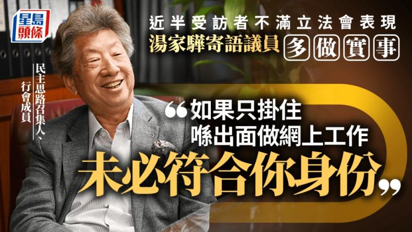 民主思路昨日發表調查,顯示48%受訪者不滿意立法會表現,民主思路召集人、行會成員湯家驊更指,市民一般反映立法會議員較多「追捧」中央言論,較少有自己的看法。湯家驊今早(13日)在商台節目表示,對立法會不滿的比率比想像中高,認為成因繁多,但總體而言他寄語議員多做實事,不要「只顧做網上工作」。