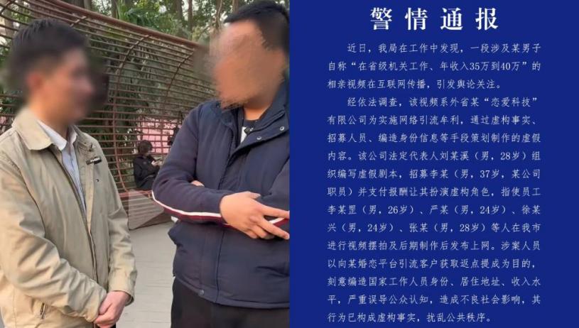 在四川,針對網傳男子發布「在省級機關工作、年收入35萬到40萬元」相睇影片,成都市公安局武侯區分局今(13)日發布警情通報稱影片為擺拍。經調查,該影片是外省某「戀愛科技」有限公司為實施網絡引流牟利,通過虛構事實、招募人員、編造身份信息等手段策劃製作的虛假內容。