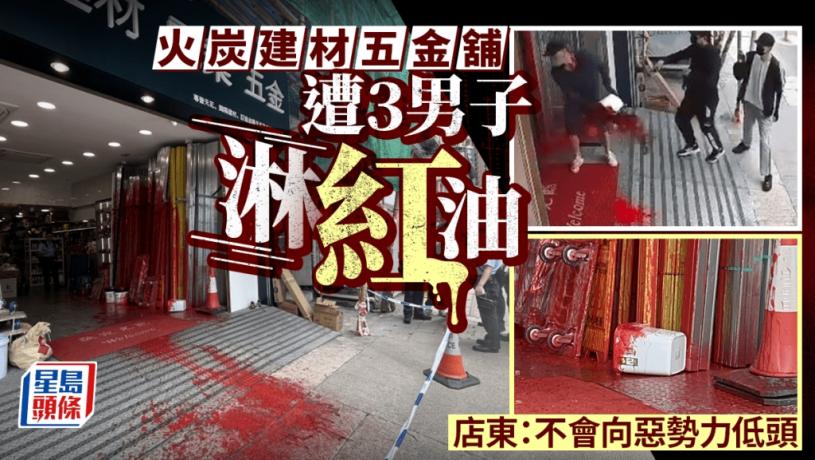 杜先生在店舖門外裝有cctv,拍得今日早上11時19分,三名穿黑衣、戴帽男子行向其舖頭,其中一人手持載有紅油的白色膠桶,他一馬當先行在前頭,另外兩男殿後,其中一男拿着手機拍攝,其後持膠桶男子將紅油潑向門口及建材,逞兇後將膠桶扔入舖內,另一同黨則一直持手機拍攝行兇過程,三人犯案後逃去。