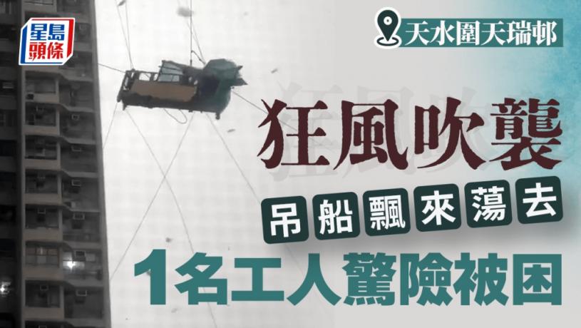 本港天氣風雲突變,多區現險情,天水圍發生工人被困吊船驚險事件,今(15日)午3時07分,一名工人在天瑞邨瑞龍樓一艘吊船工作期間,遇狂風吹襲,在空中飄來蕩去,險象環生,他高呼救命,驚動消防員到場,最終工人安全着陸。