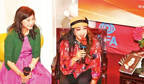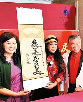 劉曉慶(中)展示她書寫的「愛美思」醫美。 方柳君提供