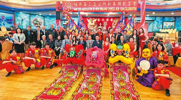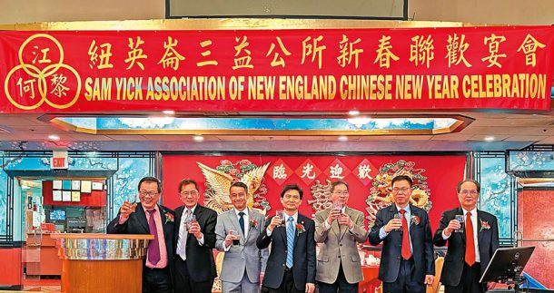 紐英崙三益公所3月15日晚假唐人街帝苑大酒樓隆重舉行蛇年春宴,300多位江、黎、何三姓宗親和僑團代表歡聚一堂,歡慶蛇年新春。出席晚宴的嘉賓包括波士頓市議員費連、紐英崙中華公所主席雷國輝、美東三益總公所主席江衛城、顧問江國驊、紐英崙三益公所顧問何遠光、黎雯、黎曉雯、黎曉玲等。