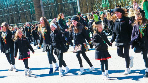 愛爾蘭少女的踏踏舞也是人們盼望的,可愛的舞者穿著艷麗的舞裙、標誌性捲捲秀髮,一路上輕快活潑的舞動,她們纖細的雙腿就像安裝上彈簧一般的靈活,她們的踏踏舞充滿了活力與韻律,舞步輕盈但具有力量,每一個少女都整齊的隨著快節奏的音樂躍動,舞鞋敲擊在地面上發出清脆的聲響。當愛爾蘭少女的踏踏舞沿途蹦跳著,圍觀的民眾都高聲歡呼與鼓掌鼓勵。