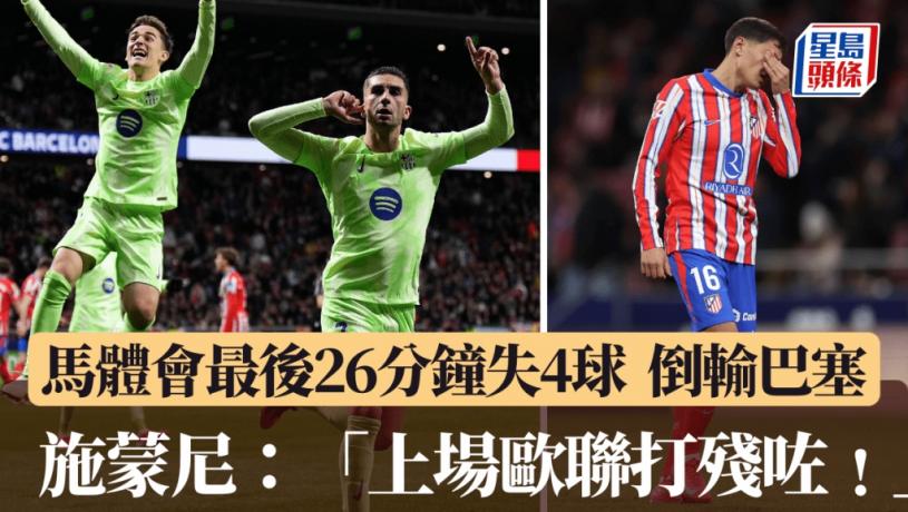 周日西甲,馬德里體育會主場對巴塞隆拿,在70分鐘領先2球下突然斷電,連同補時於最後26分鐘狂失4球,最終倒輸2:4。該隊教練施蒙特賽後解釋,球隊在上周日歐聯與皇家馬德里激戰120分鐘,身心都十分疲憊,所以未能堅持到最後。