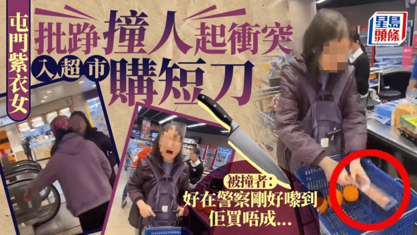 屯門商場有紫衣女子批踭撞人後,與路人發生爭執,被撞者報警後尾隨紫衣女走入超市,發現該紫衣女購物車內有把短刀,「如果唔係差人剛好嚟到佢買唔成,後果可能不堪設想。」
