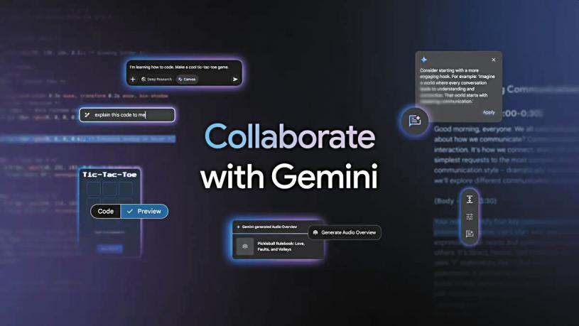 「畫布」還包括以程式設計為中心的功能,其中之一是讓用戶產生和預覽HTML、React程式碼和其他網頁應用程式原型。用戶可以請Gemini對預覽做出更改,「畫布」會隨之逐步更新。谷歌同日為Gemini帶來其語言模型NotebookLM的「語音概要」(Audio Overview)功能,為文件、網頁和其他來源建立類似播客節目、聽起來很真實的語音概要。