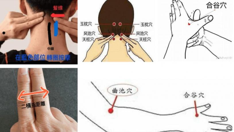 1:合谷穴位於大拇指和食指中間的虎口處。我們把拇指和食指分開,用另一手的大拇指按摩該處。2:曲池穴,手肘彎曲時,外側橫紋尾端也是可以。3:風池穴位放耳後頭枕骨下,兩側斜方肌外緣凹陷處,凹陷如池,亦是風邪常襲處,故稱「風池」。4:天柱穴位於頸椎兩側,風池穴下,約一指寬處。在中醫角度,人體經絡氣血不通自然痛,按壓穴位,可以疏通經絡,有治痛,効緩解肩頸僵硬,增強免疫力等功效。5: 按摩頸椎關節,大部分日久失修的傷患多在上頸關節,所以也可以按摩第二三四頸關節,簡單就是頸背中間橫開二指距離,在後腦髮腳下開始找痛點再加局部按摩40下,以紓緩關節腫脹硬化。