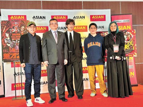 開幕夜典禮中的嘉賓。右起:亞洲躍動電影節行政主任王曉菲、「鬼才之道」的導演徐漢強、演員陳柏霖、類延峰處長、港片「臨時決鬥」導演麥啟光。梁敏育攝