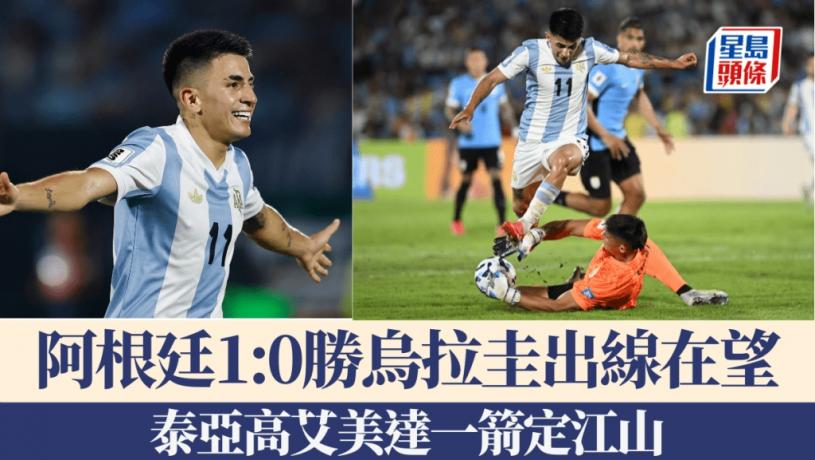 阿根廷於周五的世界盃南美洲區外圍賽作客烏拉圭,在隊長美斯缺陣之下,憑藉團體力量與烏拉圭抗衡;最後由中場泰亞高艾美達(Thiago Almada)射入全場唯一的入球小勝1:0,分組賽完成13輪以28分高踞榜首,下一輪主場對巴西拿一分,便可以提早4輪,成為首支出線決賽周的南美球隊。