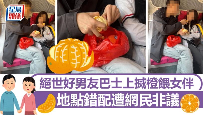 男子剝開一楷橙肉送上女伴的嘴邊。fb「香港九巴及龍運服務及投訴討論區」截圖